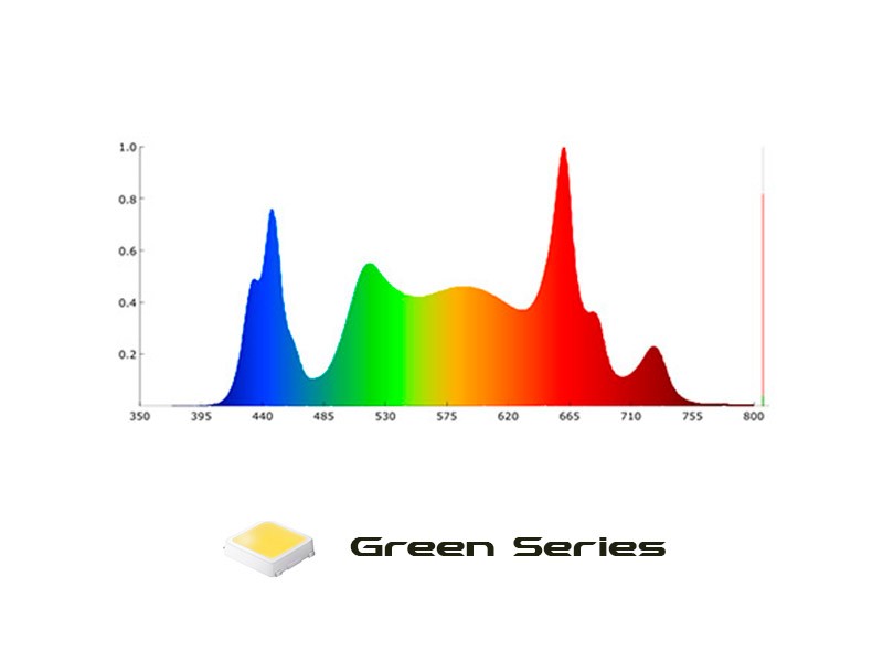 Utilizamos LEDs de marcas líderes en la industria como Samsung, Cree, Hongli, TYF y Osram, incorporando los últimos avances en fotobiología. El espectro Green Series combina azul dual (435 + 450 nm), verde reforzado (520 nm) y rojo dual (660 + 730 nm) para potenciar la fotosíntesis y la floración. Esta composición activa múltiples rutas fotobiológicas y aprovecha el efecto Emerson, mejorando la eficiencia fotosintética, la penetración en el canopy y la producción de flores densas y resinosas.